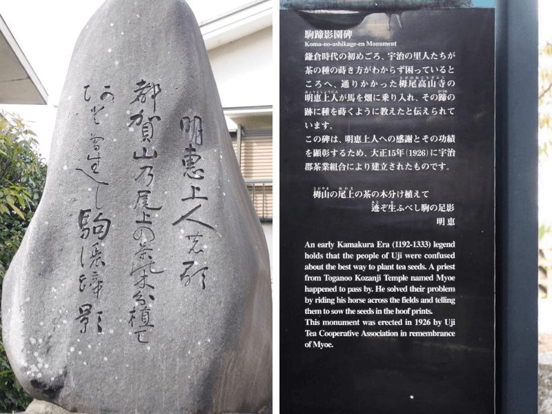 この石碑は宇治茶の始まりを今に伝え、栂尾高山寺の明恵上人の功績を讃える顕彰碑。