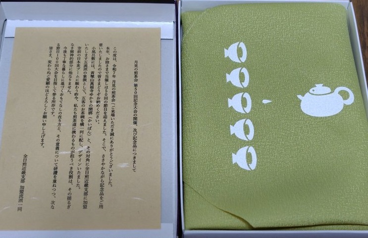 今回、50回の節目の記念にと、茶会参加者に小風呂敷が贈られた。五色あったそうなのだが、箱を開けてみた所、少し緑がかった黄色。偶然か茶席の菓子と同じ色で、月の欠片を頂いて帰った気分になったのだった。