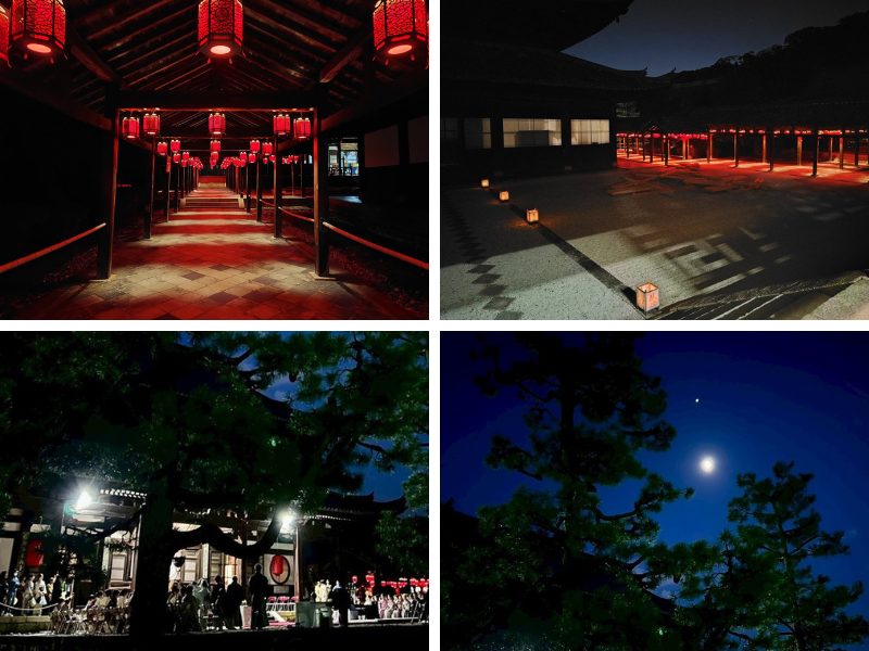 日が暮れ、灯籠の明かりが灯されると、境内の雰囲気は一変し、幻想的な世界に。闇夜に浮かぶ赤灯籠。