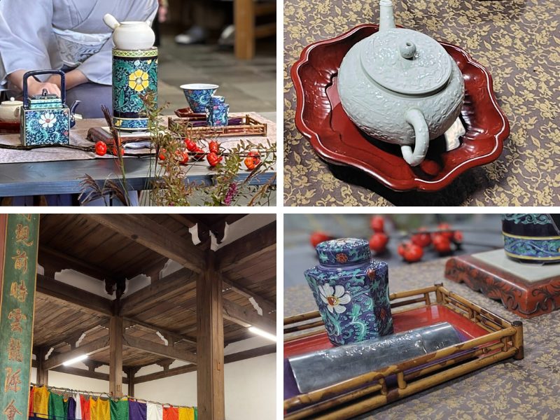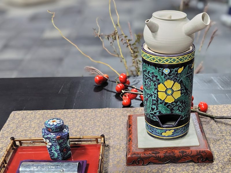 文様がなくつるんとした無地の交趾もあるが、お茶席で用いた煎茶道具は、交趾といっちんの技法を組み合わせ、文様が浮き出て見えるもの。ケーキにデコレーションするように絞り出しで線を描き、釉薬で色を載せていく。説明があっていたか心配になり後で調べたのだが、間違いがなくてよかった。